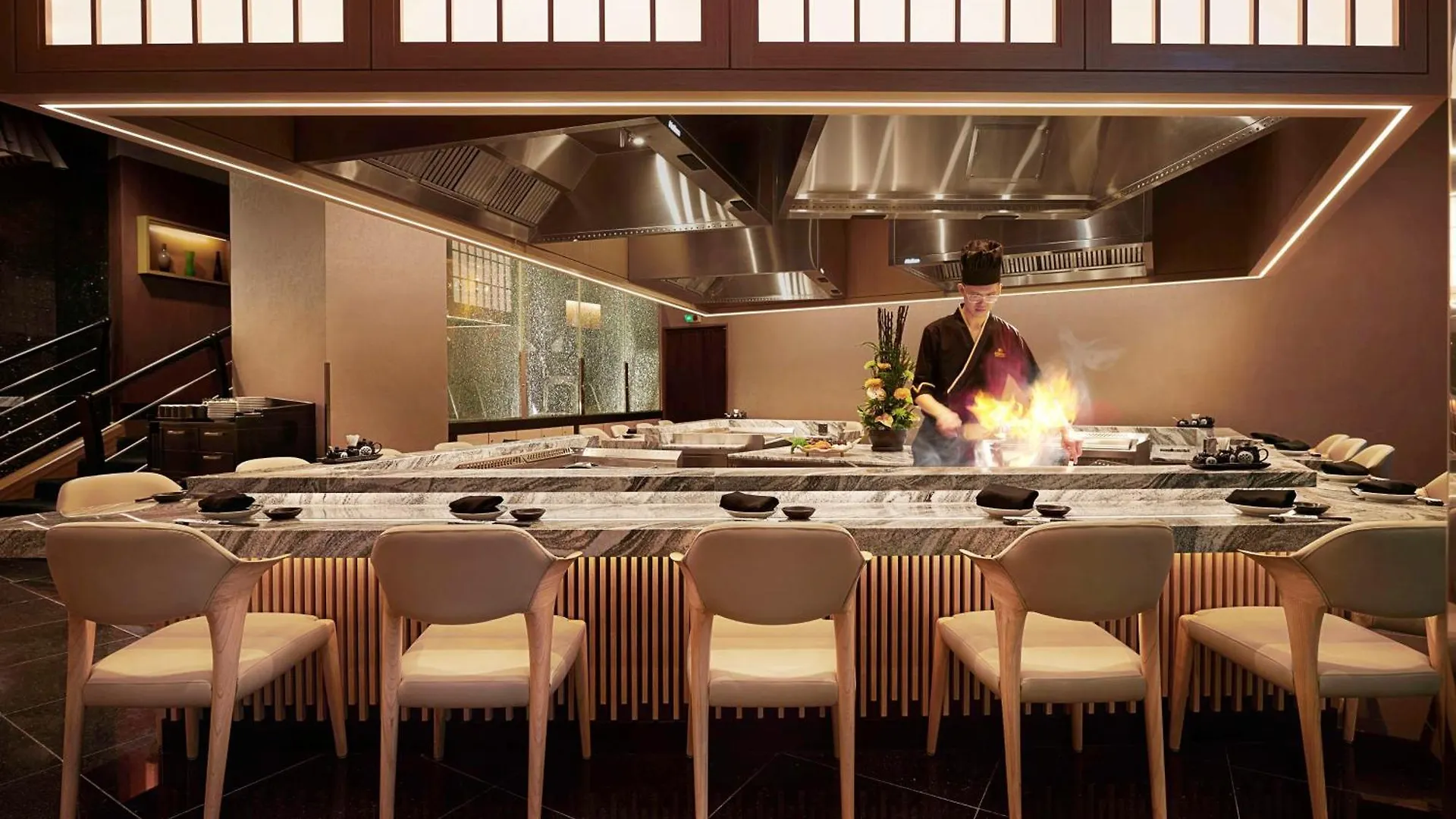 Det finns personligt kassaskåp, klädloge och arbetsbord samt te-/kaffebryggare, kylskåp och köksredskap. Rummen är inredda med skrivbord. Dessutom har de minibar och te-/kaffebryggare. De badrummen i marmor är utrustade med en regndusch och en badtunna. Dessutom finns det hårtorkar och badrockar. Du kan njuta av utsikten över staden medan du bor på detta 38-våningars boende.